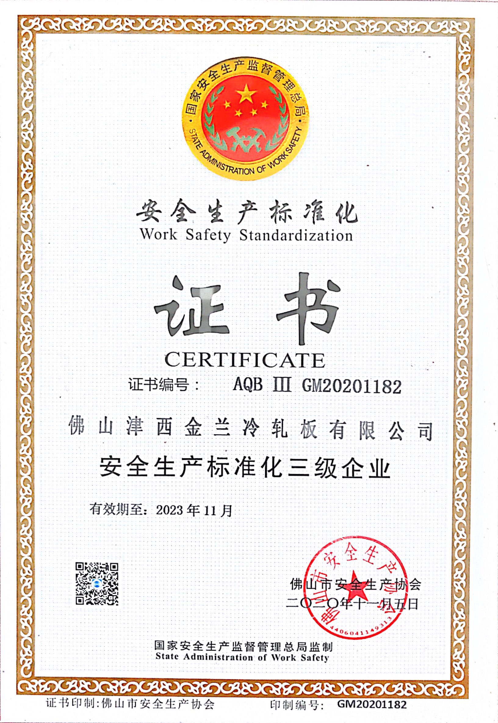 为进一步提升公司安全管理水平,我司对照安全生产标准化三级企业评审要求,积极组织开展评审工作,于近期顺利通过佛山市安全生产协会合规性审查,核准佛山津西金兰冷轧板有限公司为“安全生产标准化三级企业”。