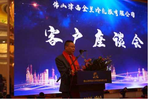 座谈会由公司副总经理张伟主持,首先由公司董事长兼总经理刘永存致欢迎词,代表津西集团、津西金兰董事会和全体干部员工向参会的各位嘉宾和广大客户朋友表示热烈的欢迎和衷心的感谢!他在讲话中指出,2021年是国家“十四五”计划的开局之年,是津西集团冲刺“世界五百强”的关键之年,也是津西金兰实现“造血”之后健康跨越发展的起步之年。2021年,津西金兰将大力推进高品质战略,实施产量“倍增”工程,我们现已投入1225万元,全力组织恢复1480轧机,1250镀锌机组和1250硅钢机组的正常生产,节后产能规模将由30万吨达到60万吨,此外,还将投入1050万元对设备进行大修技改,大力提高产品质量和交付能力,真正实现管理升级、装备升级和产品升级。在新的一年里,我们将发扬一张蓝图绘到底的实干精神,秉持“诚信至上、质量第一、互利共赢”的经营理念,坚持问题导向、结果导向,致力管理创新,扎实推进高品质发展战略,为广大客户提供更加优质的产品和更加周到的服务。我们坚信,有集团的坚强领导和强大后盾,有在座的各位嘉宾朋友一如既往的支持和不懈努力,我们的事业一定更加美好,我们的合作前景一定会更加广阔,我们的明天也一定会更加灿烂辉煌。